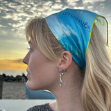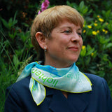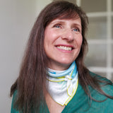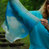 The scarf LIGHTEN UP comes in two different sizes. One is a small 'bandana scarf', the other is a full size scarf. The design is in a light color combination on a cloud image in a fine shiny silk quality. It encourages keeping a light mind and heart in life and finding ways to stay light in the face of adversity. It brings a smile :)